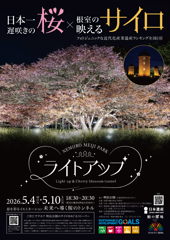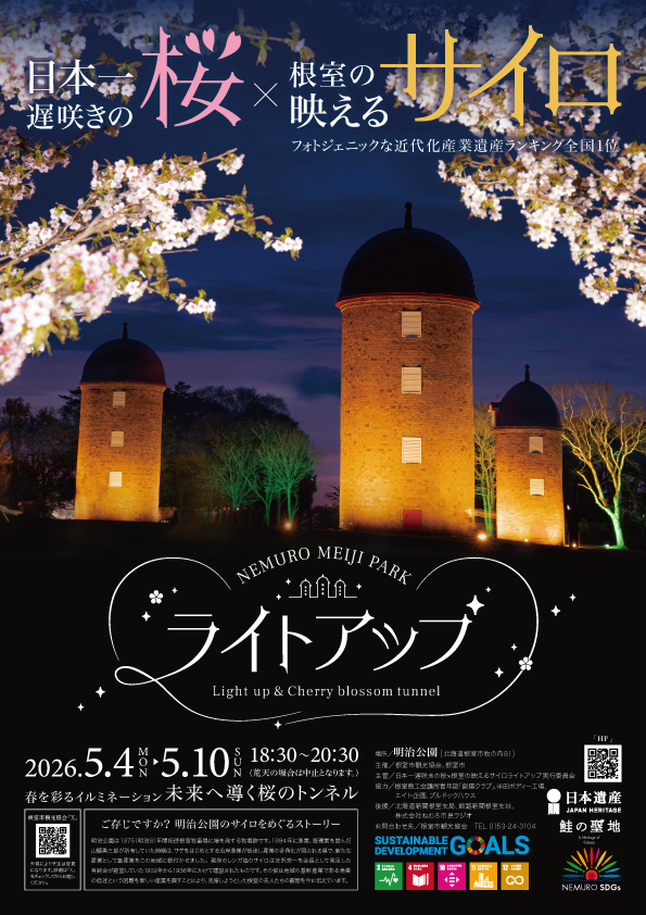 明治公園のチシマザクラと3基のサイロをライトアップすることにより魅力的な景観を演出し