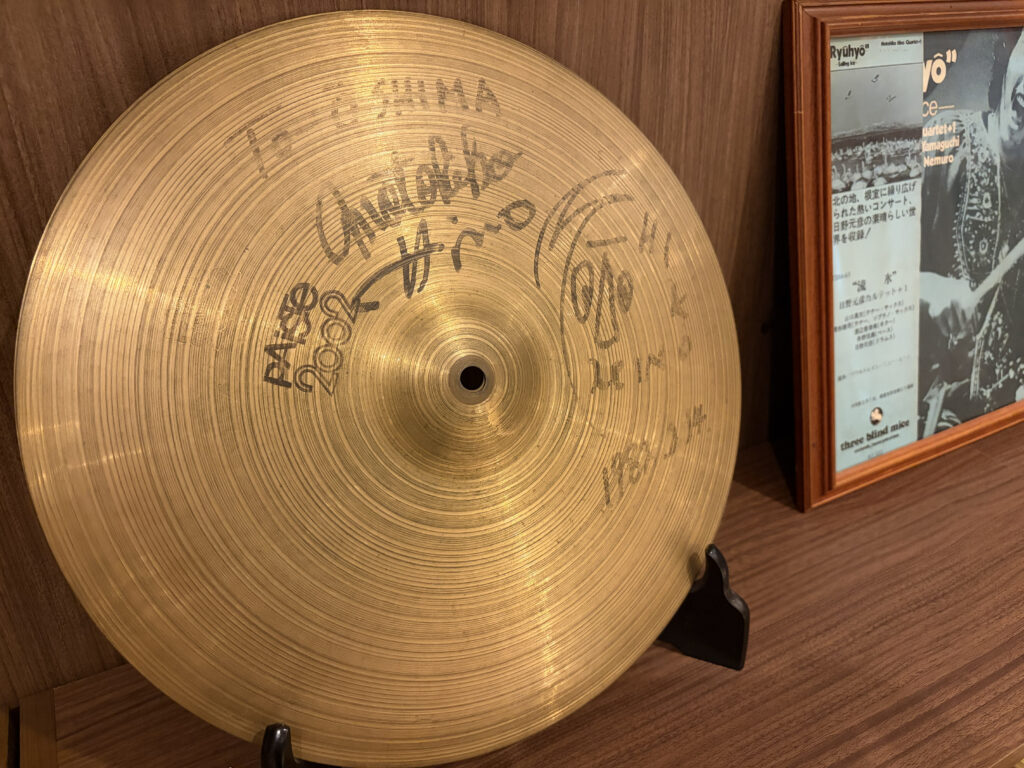 この時期に、根室高校ジャズ研究会でトラムを担当していた方が日野元彦さんの楽屋を訪れ、自身のドラムシンバルにサインをいただいたそうです。これも小さなまち根室ならではのエピソード。